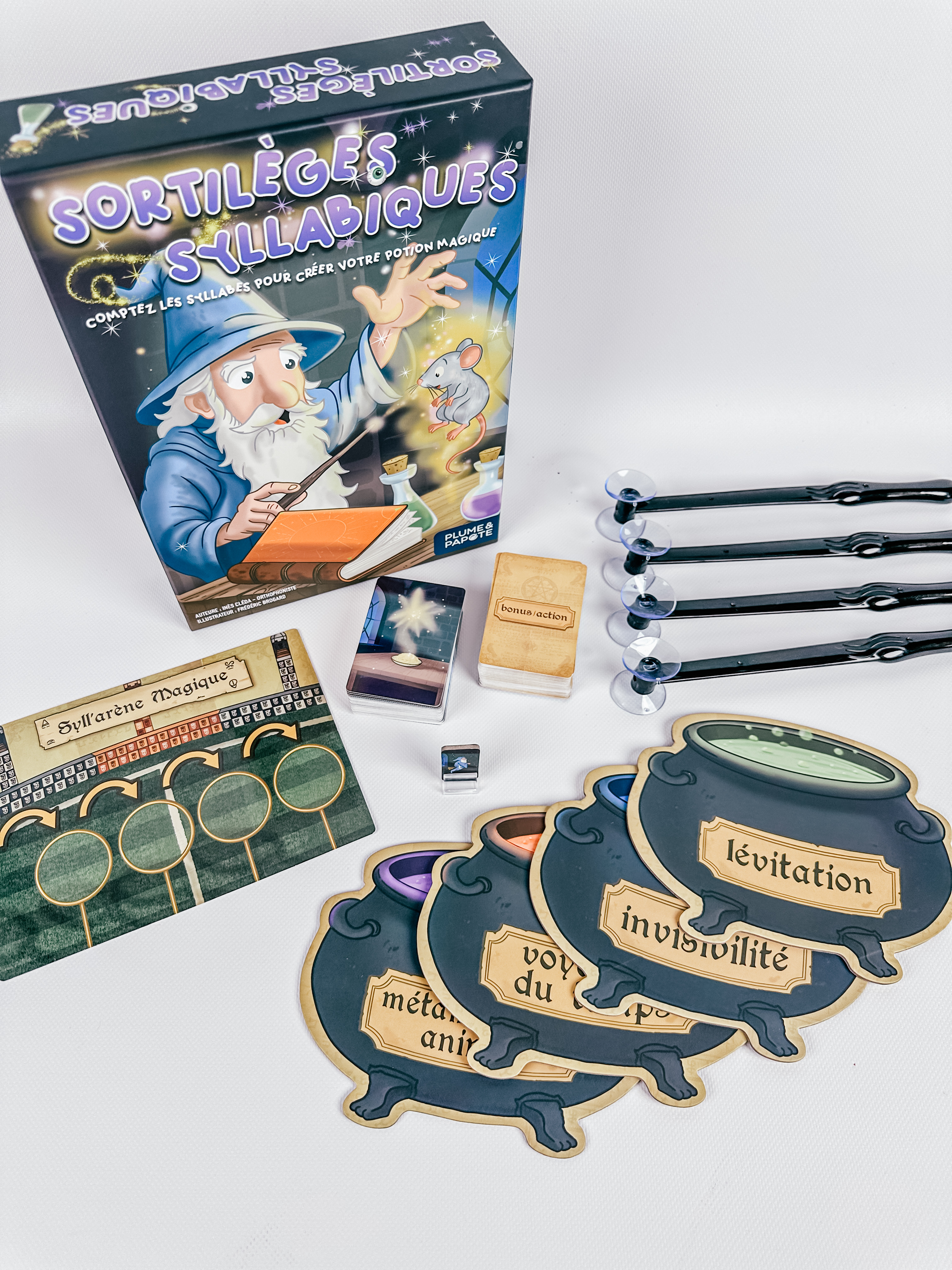 Principe : attraper une carte avec la ventouse, reconnaître un mot, compter ses syllabes et la placer dans sa potion !
